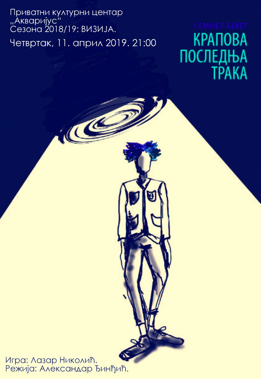 Монодрама Семјуела Бекета „Крапова последња трака“, у којој игра, и коју је режирао Лазар Николић, одиграће се, по трећи пут ове сезоне, у Приватном културном центру „Акваријус“у четвртак 11. априла 2019. године од 21 час. Представа чије је супервизор Александар Ђинђић, професор на митровичком Факултету уметност, у чијој класи Николић студира глуму, бави се проблемом људске егзистенције и отуђености савременог живота. Кроз песимистичку визију света видимо човека сведеног на физиолошко и духовно вегетирање, као и бесмислено трајање испуњено патњама и узалудним ишчекивањем спаса. Комад Лазара Николића до сада је, осим у Косовској Митровици, игран и у Београду, те у Словенији (Рогашкој Слатини, Томај).